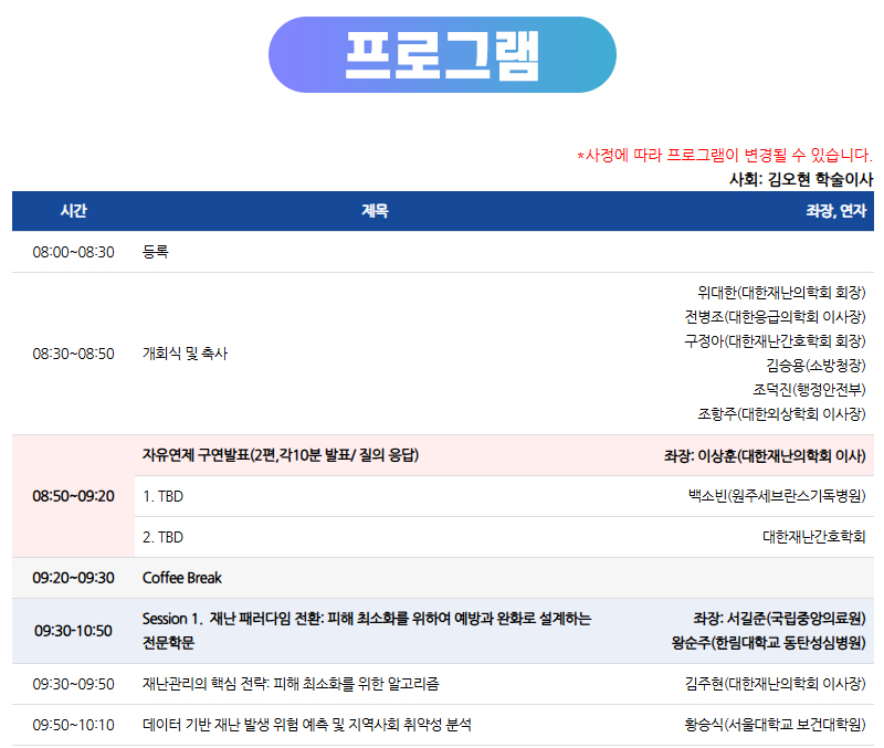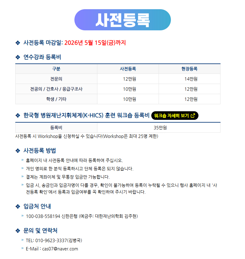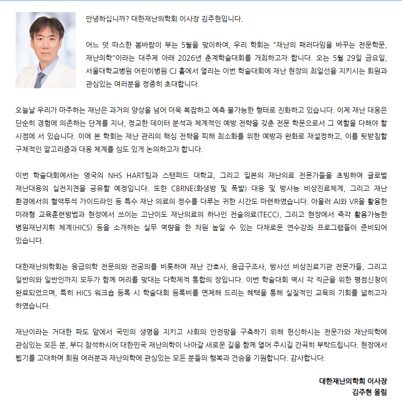 2026년 대한재난의학회 춘계학술대회 사전등록 안내(26.05.29 서울대학교 어린이병원)